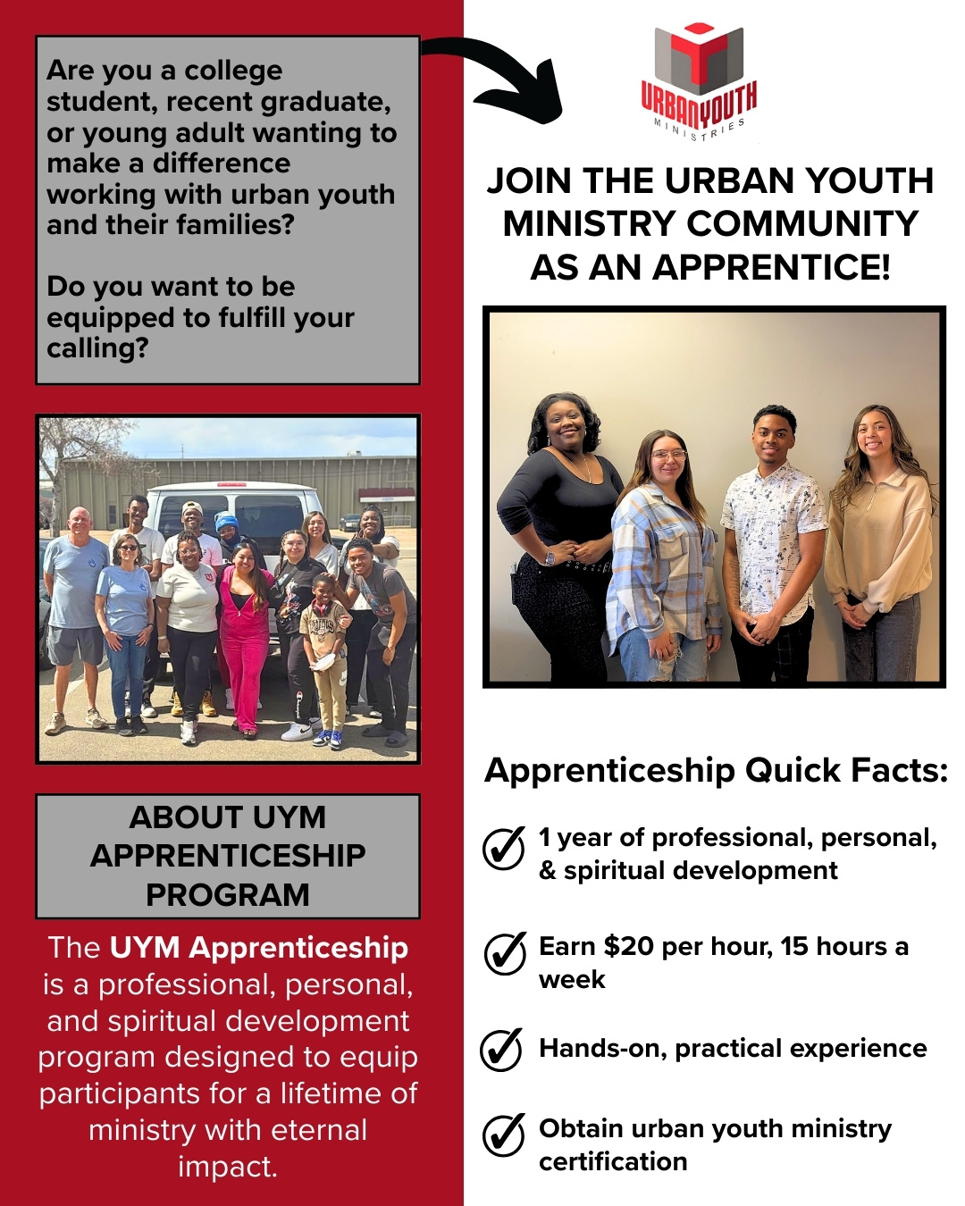 The UYM Apprenticeship is designed to equip young adults who are passionate about following Christ and making an eternal difference in the next generation — all while growing personally, professionally, and spiritually, and having fun on the job!